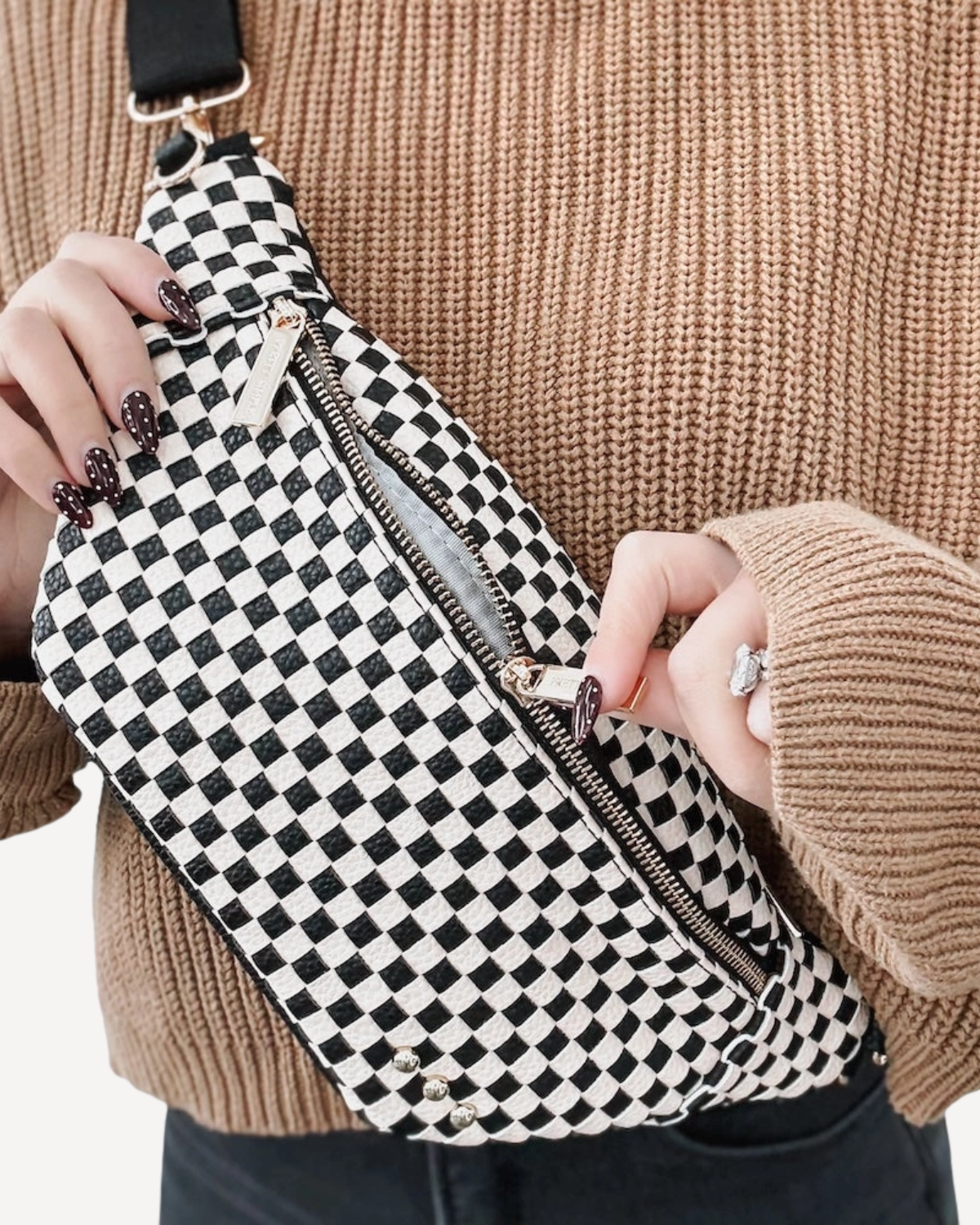 Slip on the Woven Susie Bum Bag and keep your essentials close in style. This vegan leather beauty features a zippered pocket, lip gloss slots, mini pocket, and back pocket—all the storage you need without the fuss. Checkered tan perfection for any outfit.