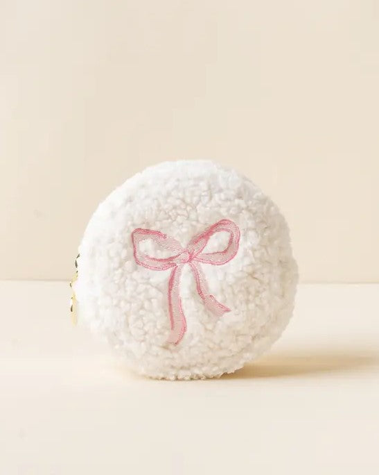 Keep your essentials stylish and organized with our circle teddy pouch. Crafted from soft sherpa fabric, this compact pouch features a wipeable lining for easy cleaning and gold zippers and hardware for a touch of sophistication. The interior is lined with a playful printed fabric. Perfect for holding smaller items like lipstick or chapstick, this pouch also pairs beautifully with our rectangle or square options.