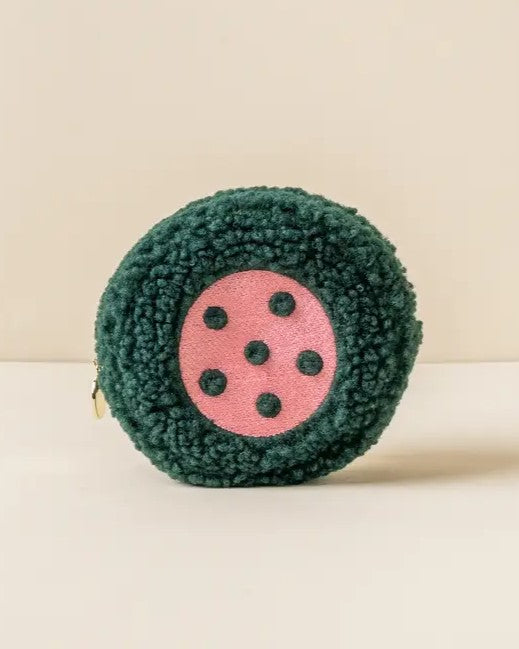 Keep your essentials stylish and organized with our circle teddy pouch. Crafted from soft sherpa fabric, this compact pouch features a wipeable lining for easy cleaning and gold zippers and hardware for a touch of sophistication. The interior is lined with a playful printed fabric. Perfect for holding smaller items like lipstick or chapstick, this pouch also pairs beautifully with our rectangle or square options.