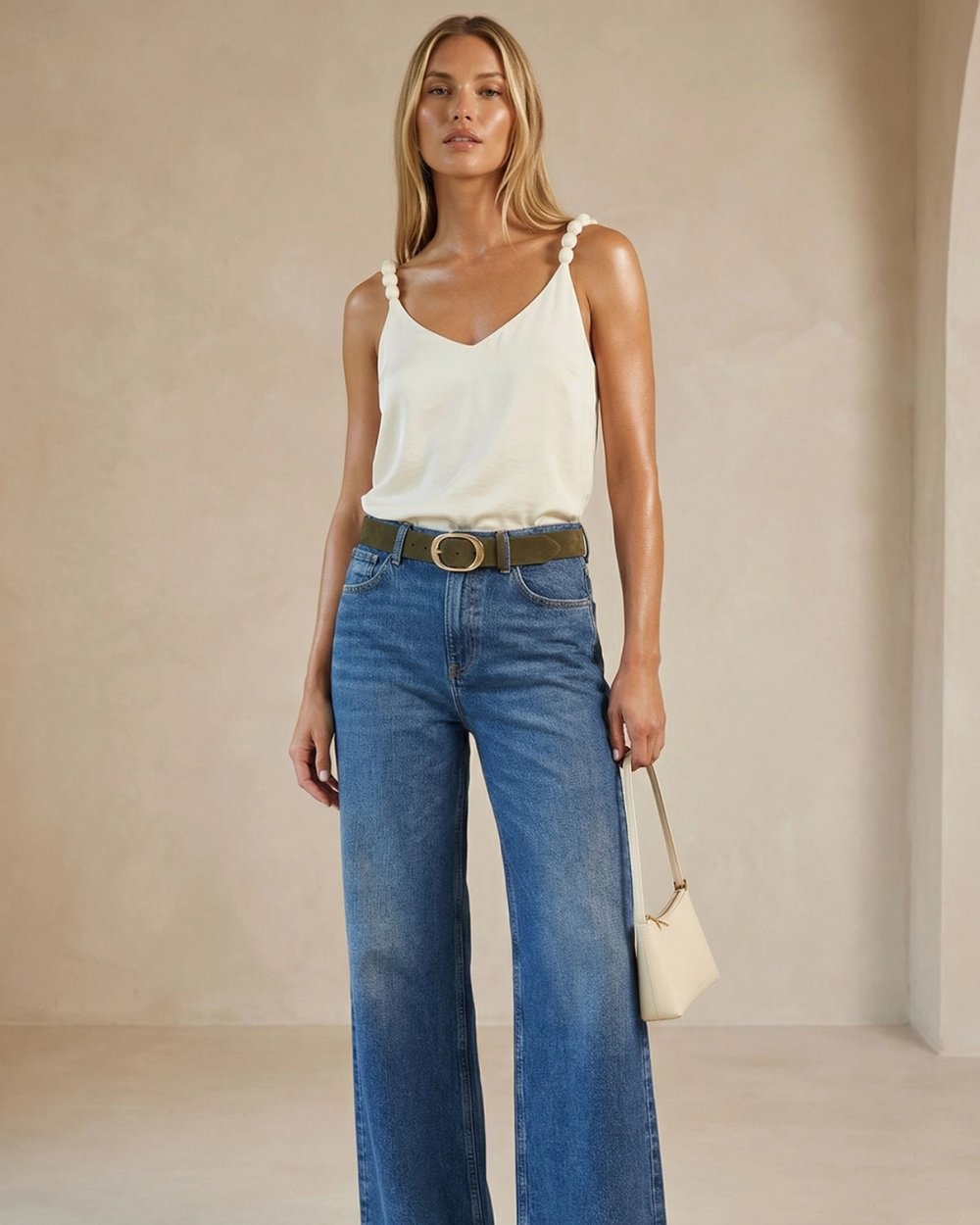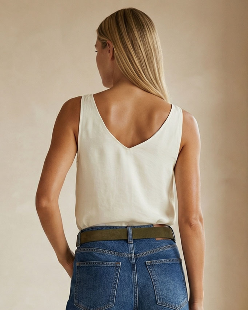 Elevate your wardrobe with this sophisticated V-neck tank crafted from luxurious silky satin. The signature bubble-style strap accents deliver a refined, feminine aesthetic that transitions seamlessly from boardroom to brunch. Its smooth drape pairs beautifully with tailored trousers or a flowing midi skirt for understated elegance.