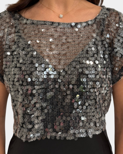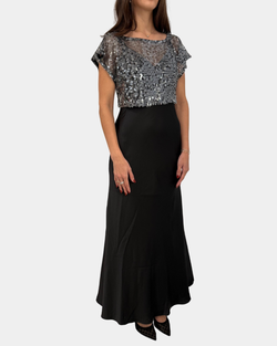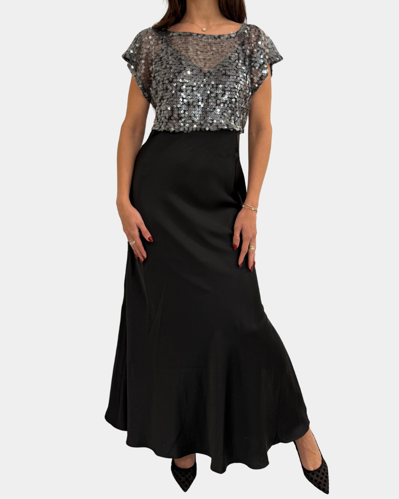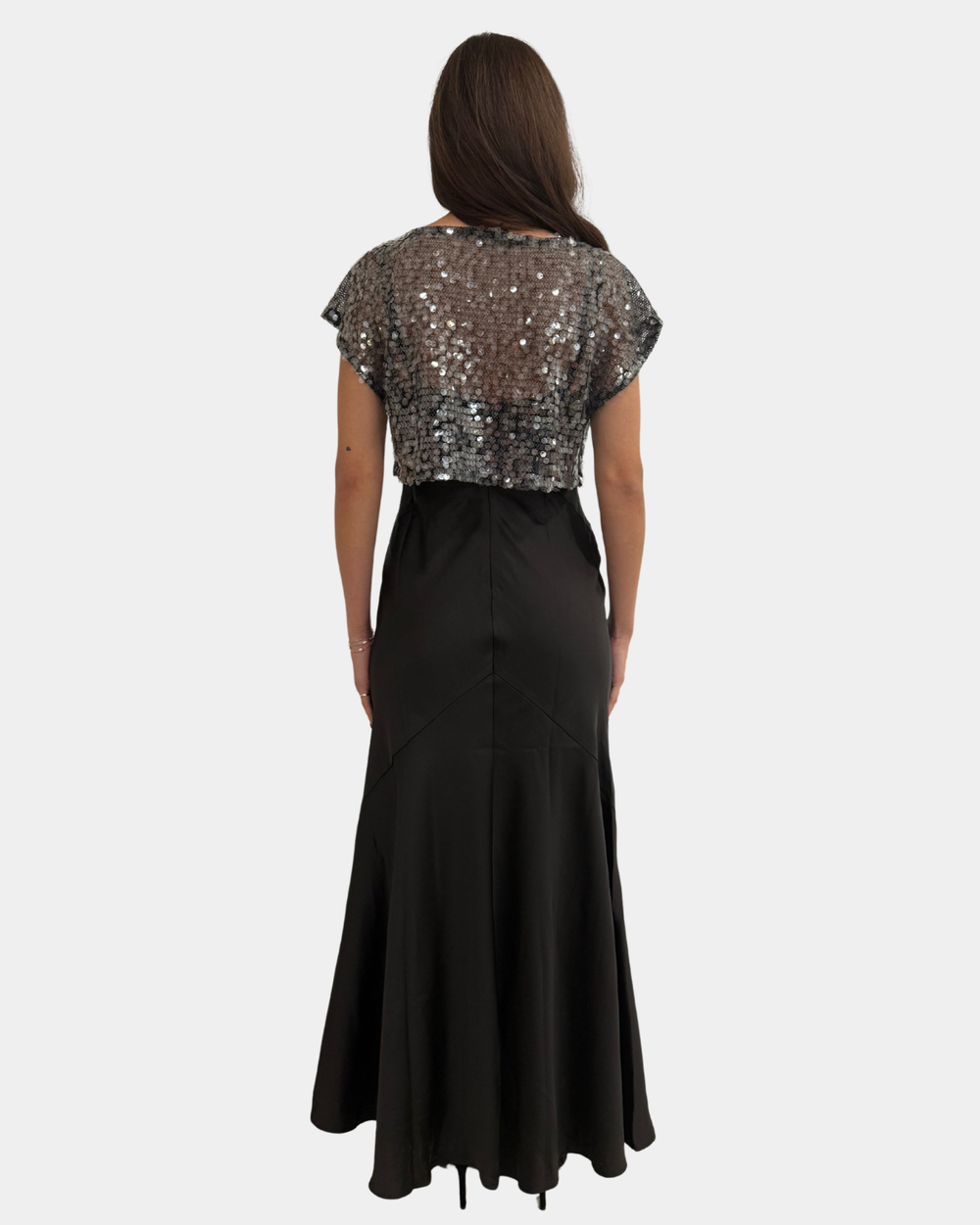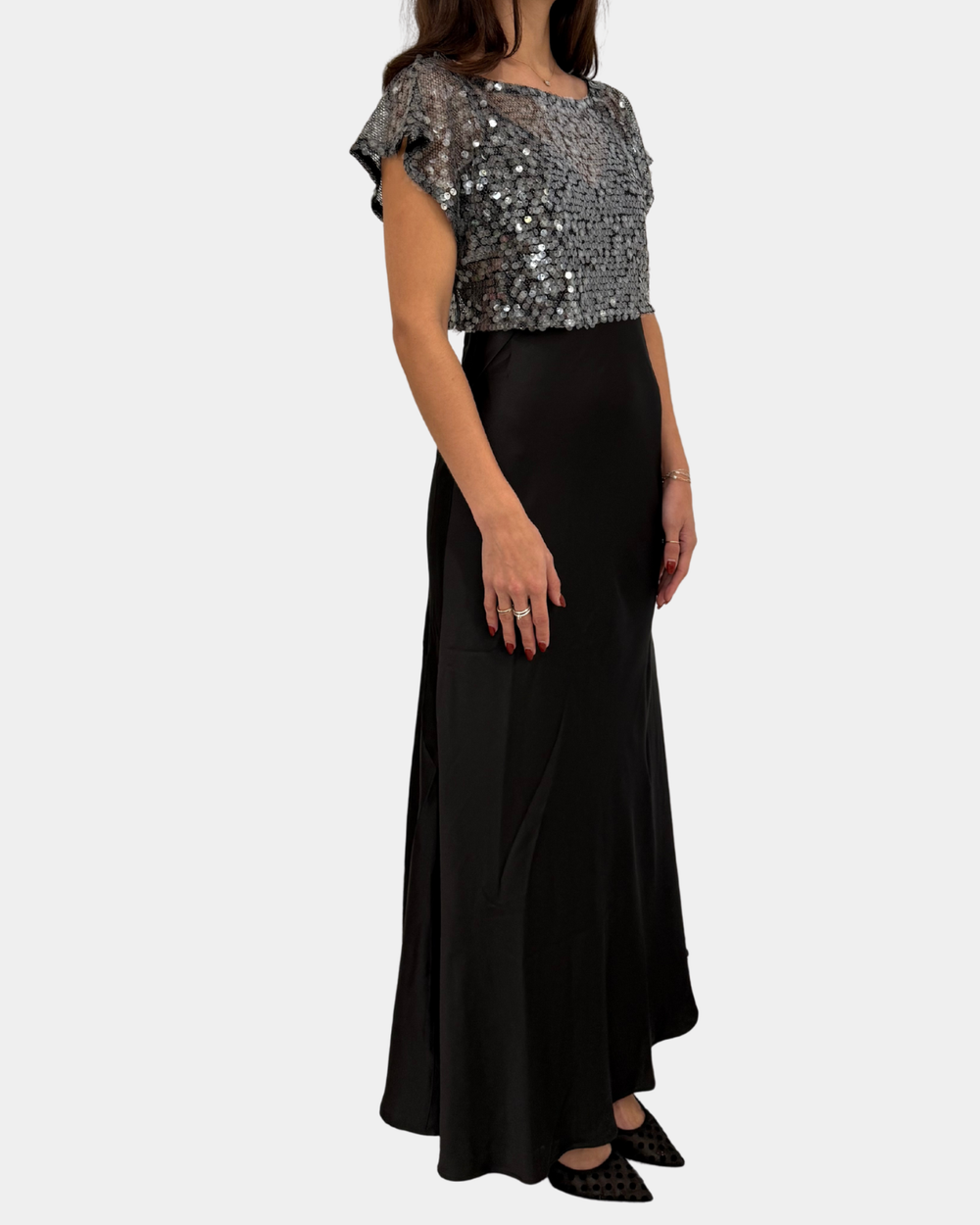 The Steve Madden Myla Dress combines sparkle and elegance in one show-stopping piece. Sequin mesh top meets silky satin skirt for dynamic texture play, while flutter sleeves and a fitted waist leading to an A-line maxi create a flattering, graceful silhouette.