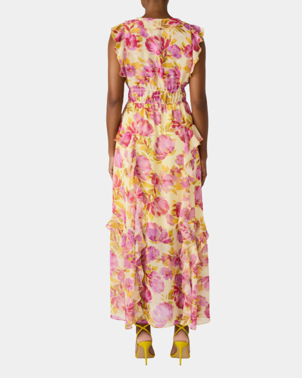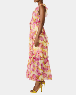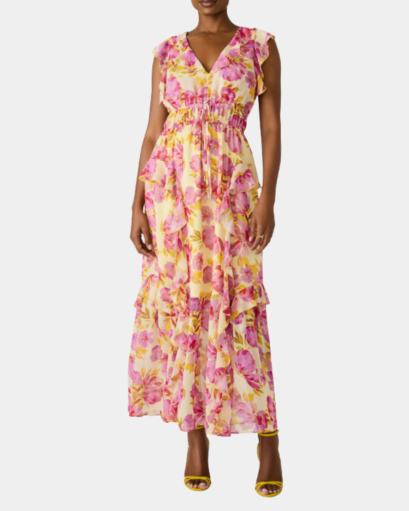 Twirl in this dreamy maxi with playful ruffles and a vibrant floral print. Smocked waistline keeps things flattering while the floaty layers move with you. Pure romance in every step.