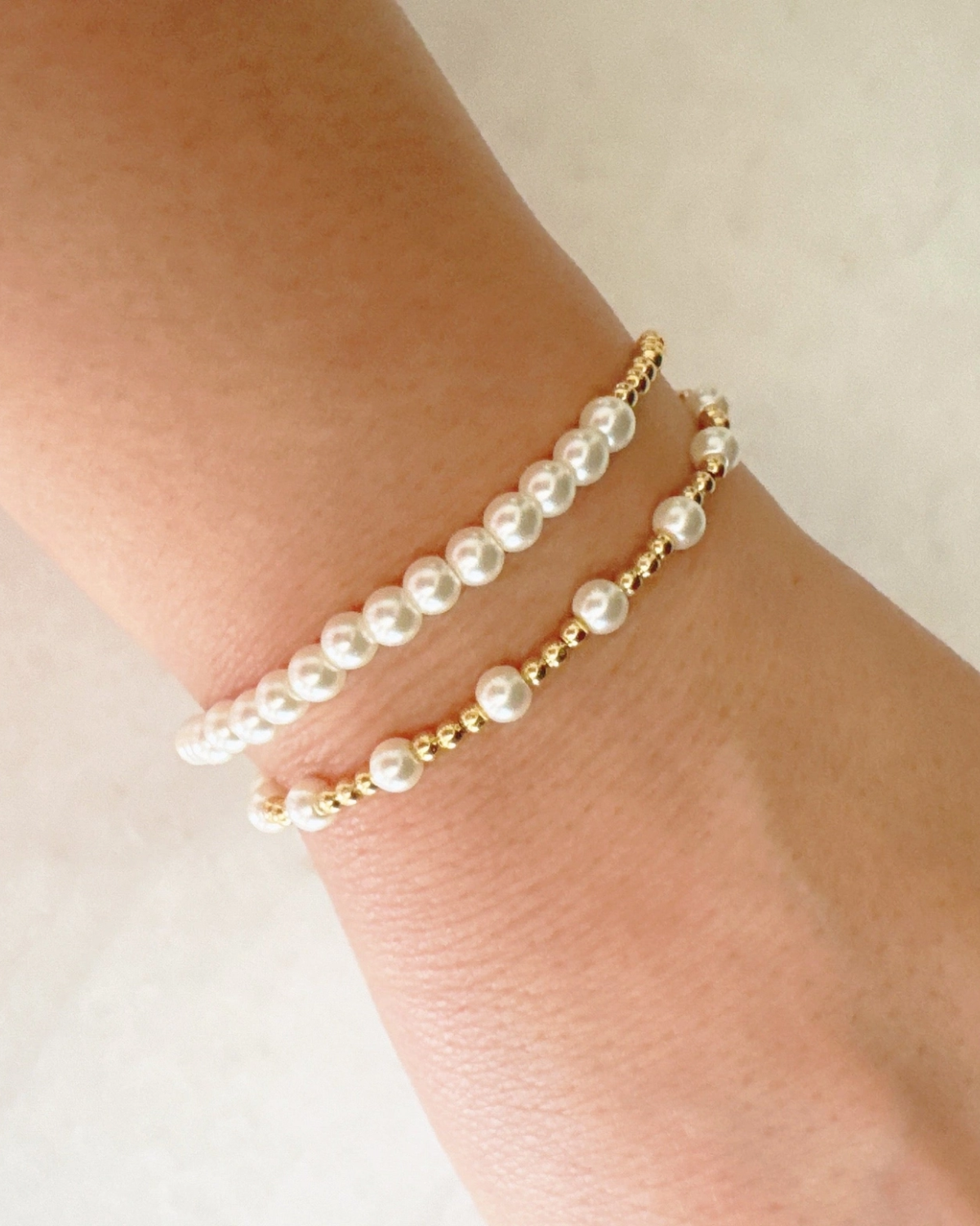 Elevate your everyday style with this stunning set of two stretch bracelets that seamlessly blend classic elegance with modern versatility. Each bracelet features glass pearls and radiant gold beads, creating a sophisticated look that works beautifully worn together or layered with other pieces.