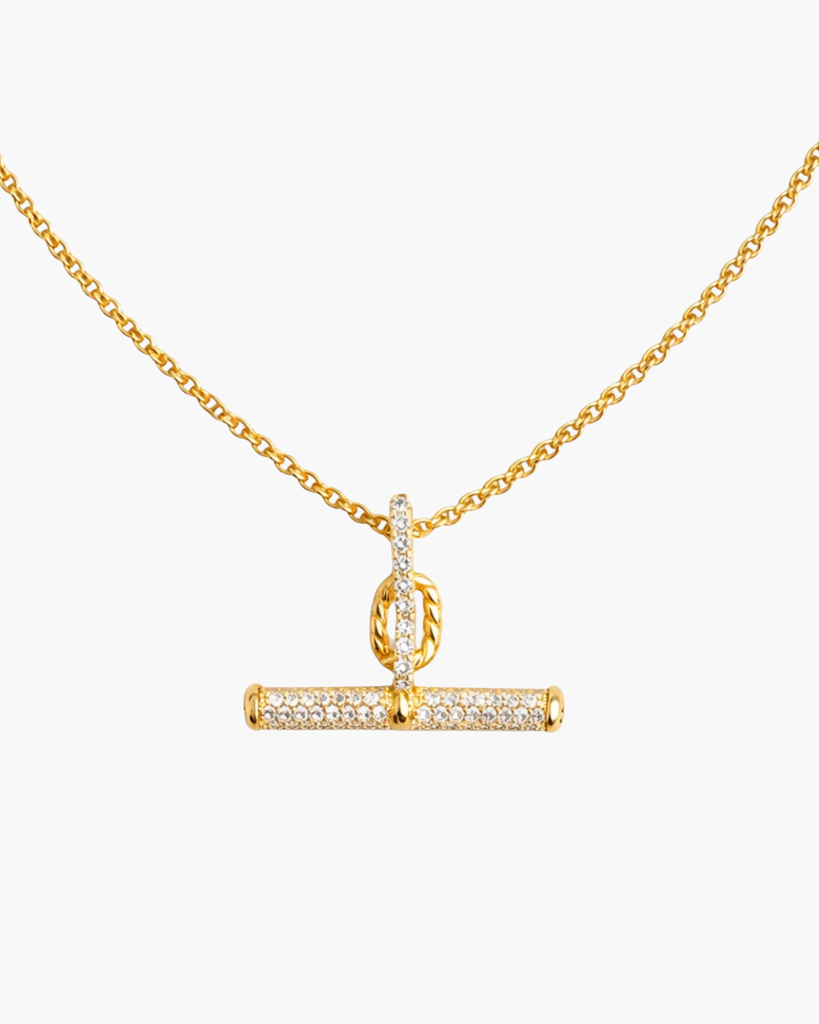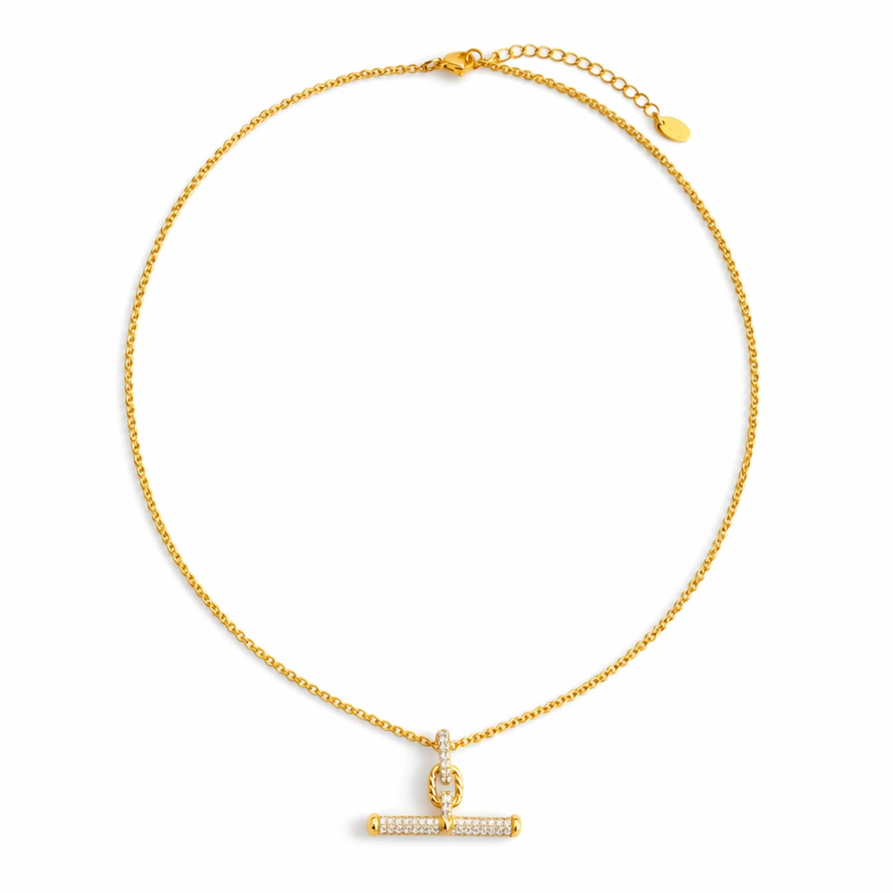 Sophisticated simplicity meets subtle glamour in the Pavé Accent T-Bar Necklace. A polished gold chain showcases a geometric T-bar pendant adorned with delicate pavé sparkle. Effortlessly versatile, it's equally stunning worn solo or layered with other pieces.