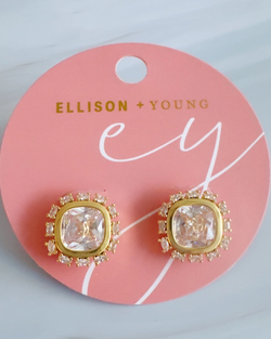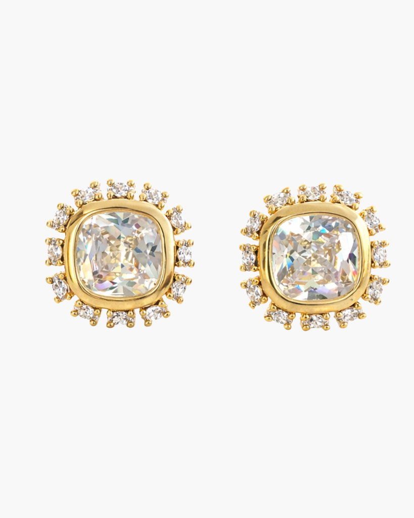 Elegant crown studs with a luminous center stone framed by a sparkling halo. The faceted design radiates brilliance from every angle, offering versatile sophistication for any occasion.