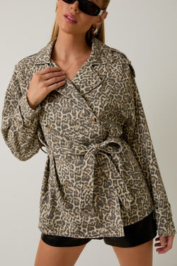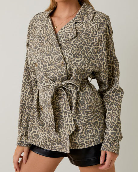 Add a fun twist to your fall outfits with this playful leopard print short trench coat. The double-breasted front and waist tie give it a flirty, flattering fit, while the cream and charcoal colors keep things stylish and easy to mix and match. Perfect for embracing autumn in bold, confident style!