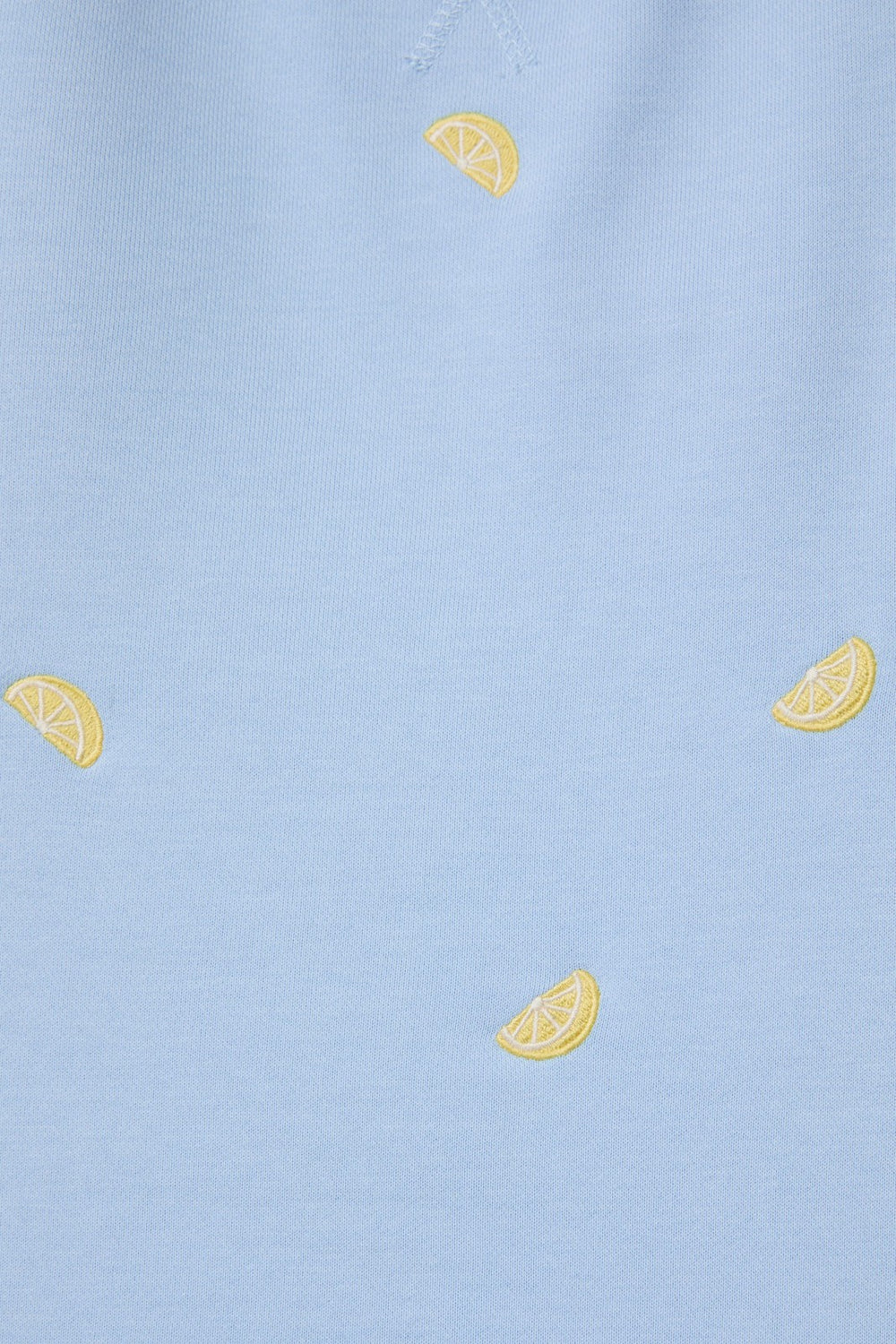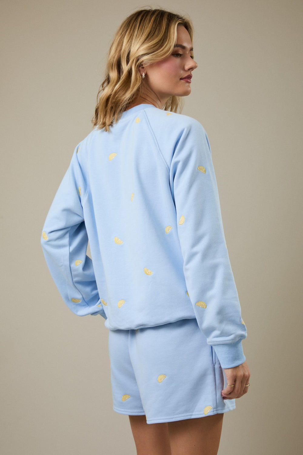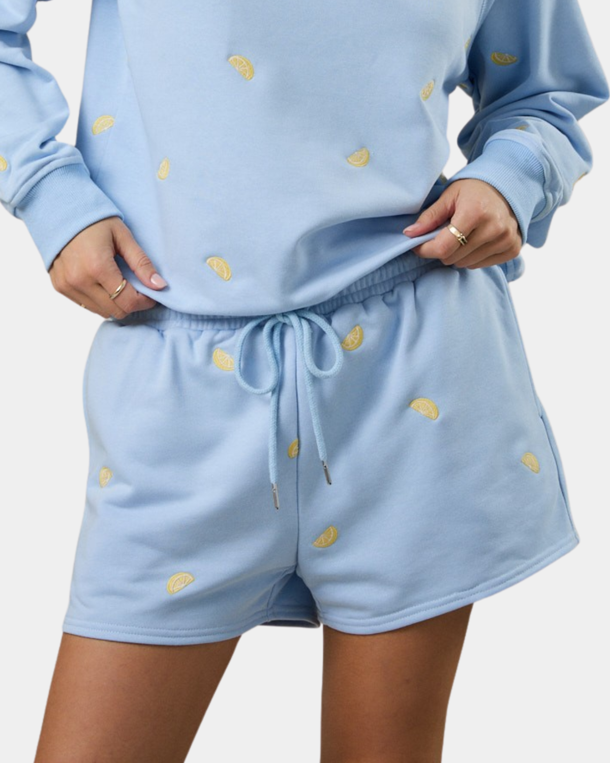 Brighten your summer wardrobe with these cheerful lemon embroidered shorts. The playful citrus design pops against the soft light blue fabric, perfect for casual days and warm-weather adventures. Comfortable, fun, and ready to make you smile.