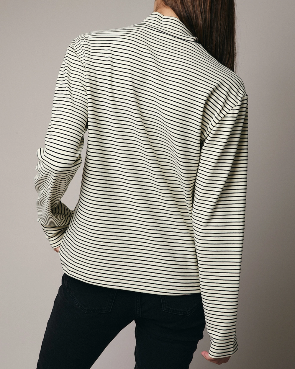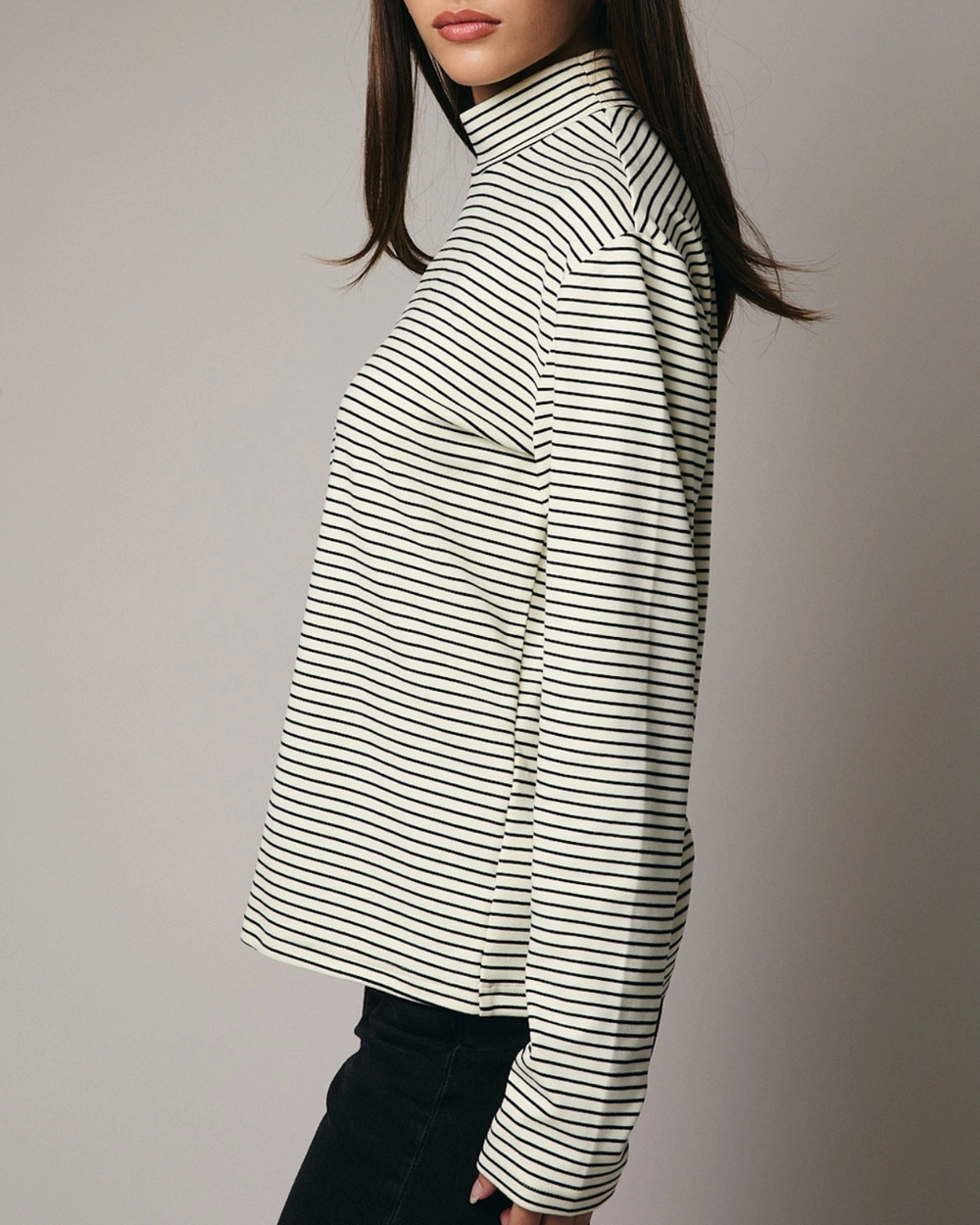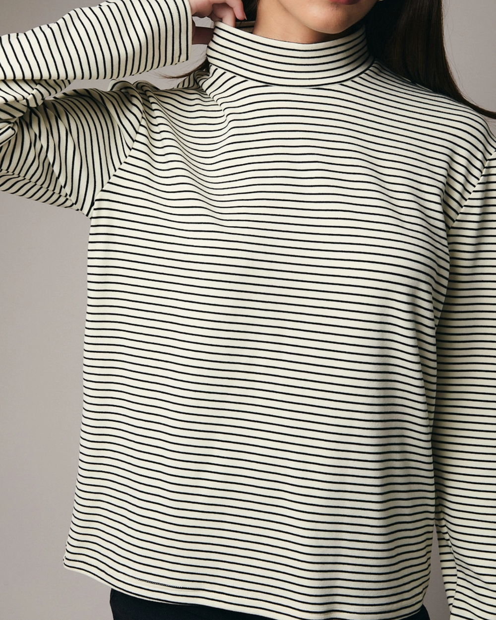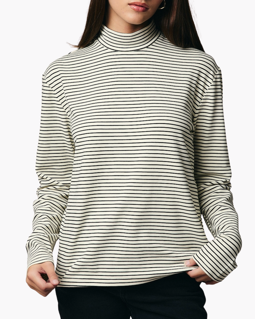 Stay cozy and stylish in this cream and black mock neck stripe top, perfect for adding a fun twist to any outfit.