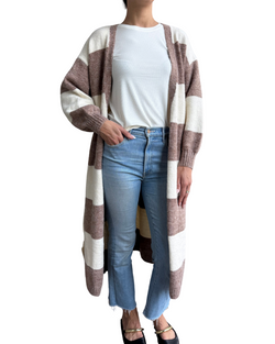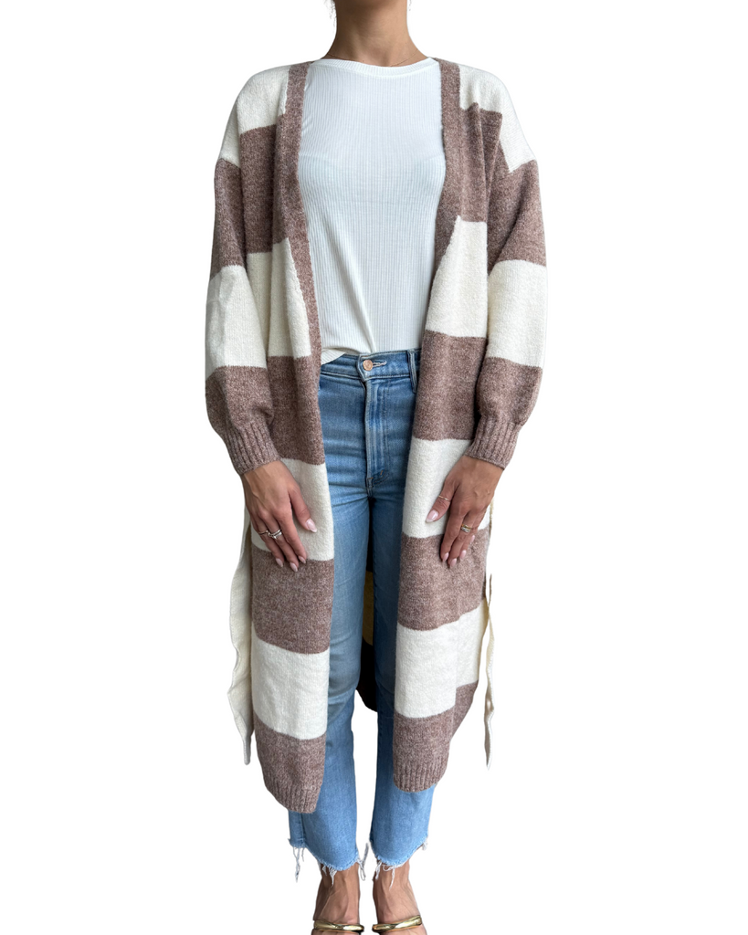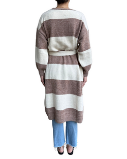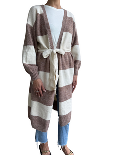 Cozy up in this playful striped belted cardigan that adds instant charm to any outfit. The cream and taupe stripes paired with a flattering belt make it your new go-to for stylish comfort.