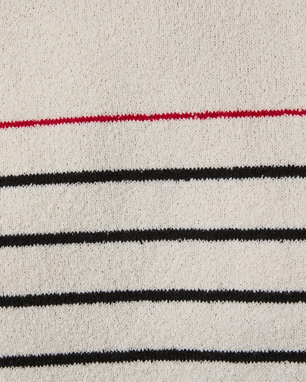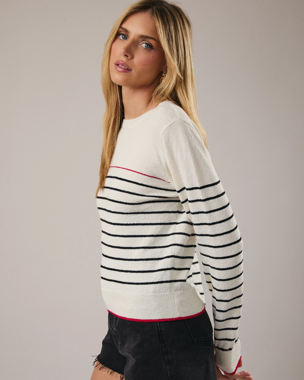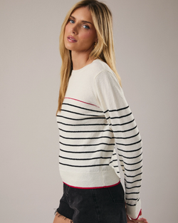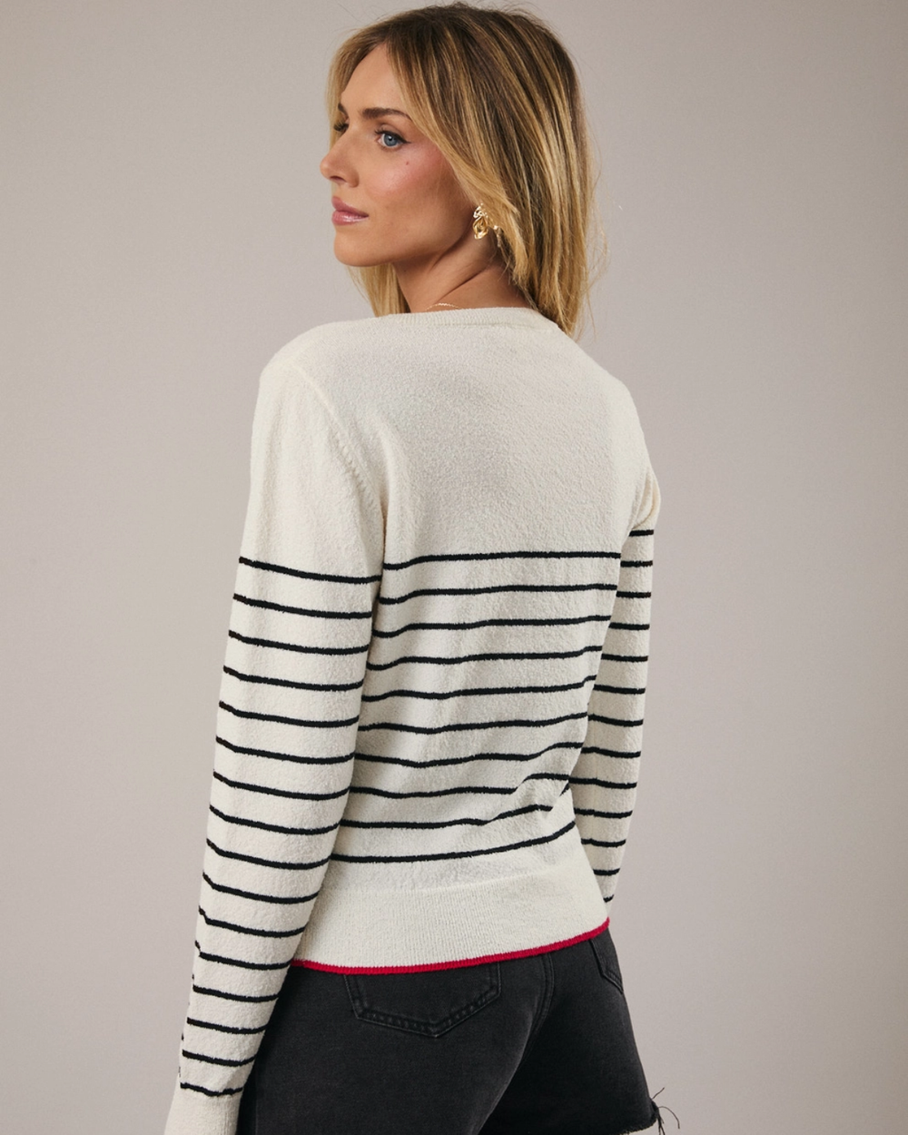 Cozy up in timeless style with this cream and black striped sweater. The classic color combo pairs with everything in your closet, while the soft knit keeps you warm and comfy all season long.